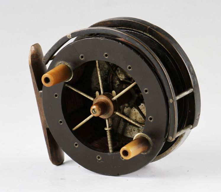 S Allcock & Co ltd “Allcock Aerial” alloy and ebonite reel: 3” dia – front flange stamped Patent – tapered horn handles – brass bickerdyke line guard with nickel silver pillars (cracked through the middle screw) – smooth brass foot filed to one end – makers details stamped to the back plate c/w script description – runs extremely smoothly – one tiny rim chip otherwise (VG)