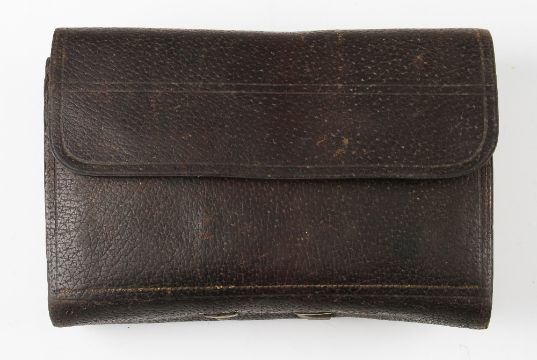 Hardy Bros Alnwick leather pigskin fly wallet – comprising parchment, cloth pages (some moth damage) – still retaining some trout flies – missing leather strap – overall 7” x 4” x 2”