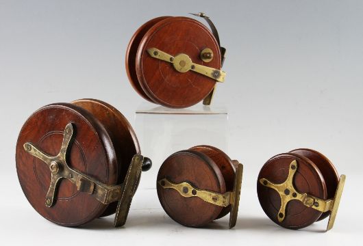 Selection of Nottingham wooden and brass reels (4) – 2x brass star backs an Allcocks 5” with rear brass drum flange (tiny screw grain crack) and a 3” - both with on/off optional checks; and 2x shaped bar backs a 4” with optional check and fitted with a removable line guard which slides onto the foot; and a 3” bar – all run well