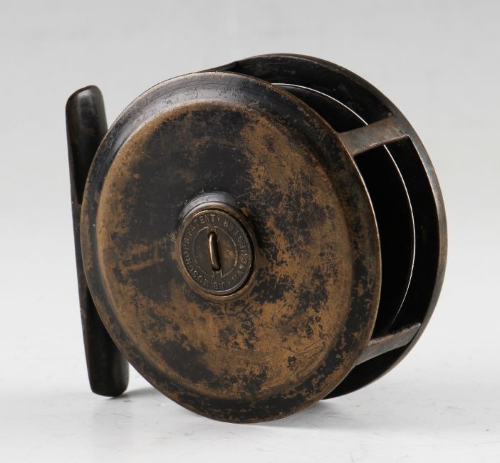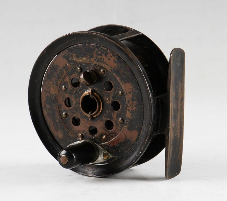 J.B Moscrop Manchester Patent small brass trout fly reel: 3” brass fly reel with black polished handle mounted on alloy plate (possibly replaced), constant check, brass makers disc to rear – runs very smoothly