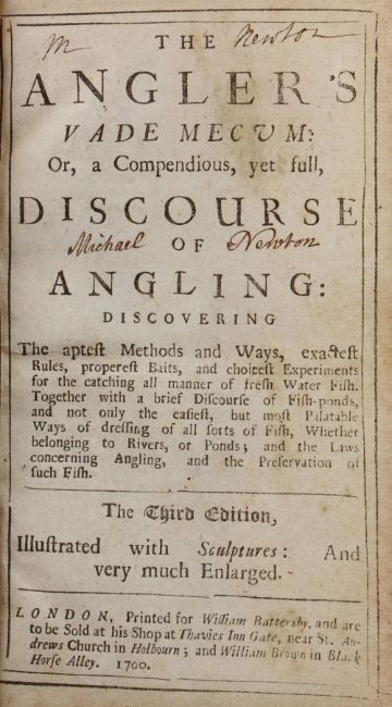 Chetham, James – The Anglers Vade Mecum or, A Compendious, Yet Full Discourse of Angling 1700, printed by William Battersby, 3rd edition, illustrated, early notes on verso of fish engraving, full calf binding