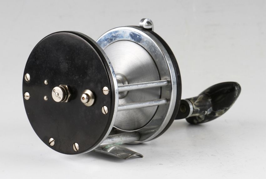 Pflueger Ohio 1978 saltwater reel, marble effect torpedo handle, ratchet and brake controls, chrome smooth foot marked B