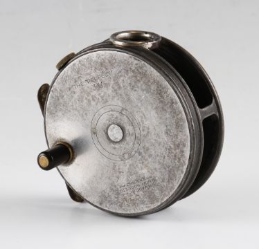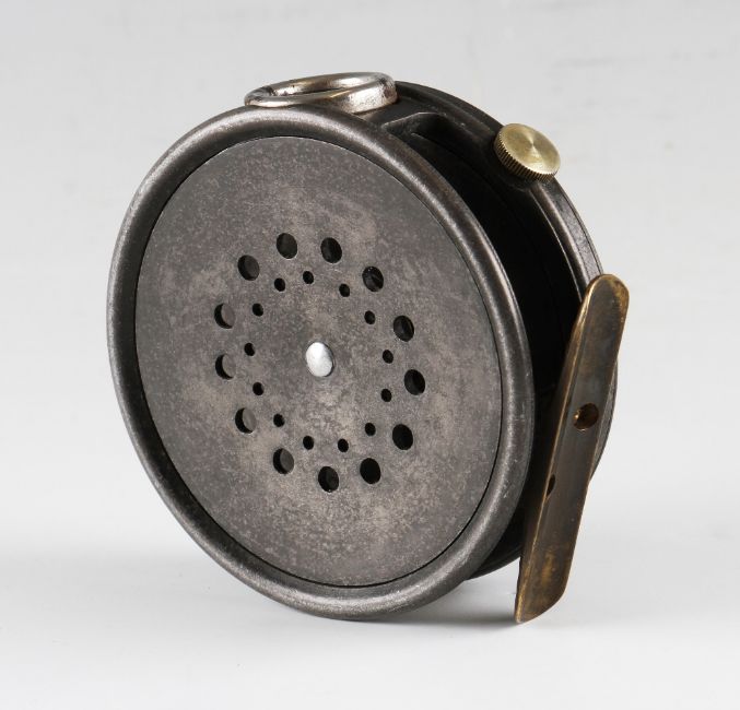 Hardy Bros The Perfect post war alloy trout fly reel – 3 3/8” dia - ribbed brass foot – nickel line guide – runs smoothly – red cloth bag
