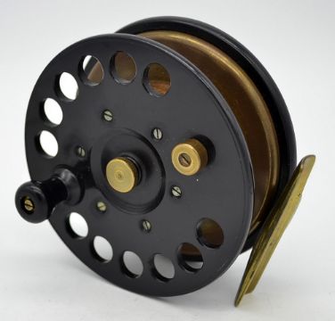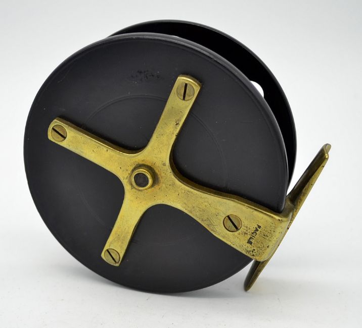 “Facile” ebonite and brass star back centre pin reel – 4.5” dia – single row of 12 perforations to the face plate, wooden drum core with brass rear drum flange – and stamped Facile to the brass star back - spins well