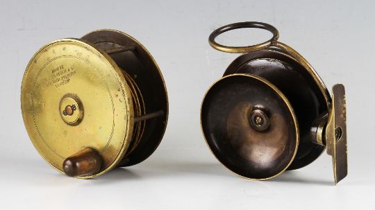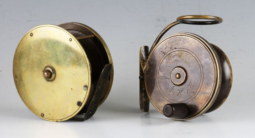 W.T Hancock & Co Makers 308 High Holborn London large brass salmon fly reel c.1895 – 4.5” dia heavy duty plate wind – foot filed back – constant check – fat horn handle – c/w silk line – some movement in the plate – otherwise runs smoothly; and a copy of Malloch’s Patent Brass sidecaster 4” dia – engraved C Harlow H Co The Strand London – good example of a copy (2)