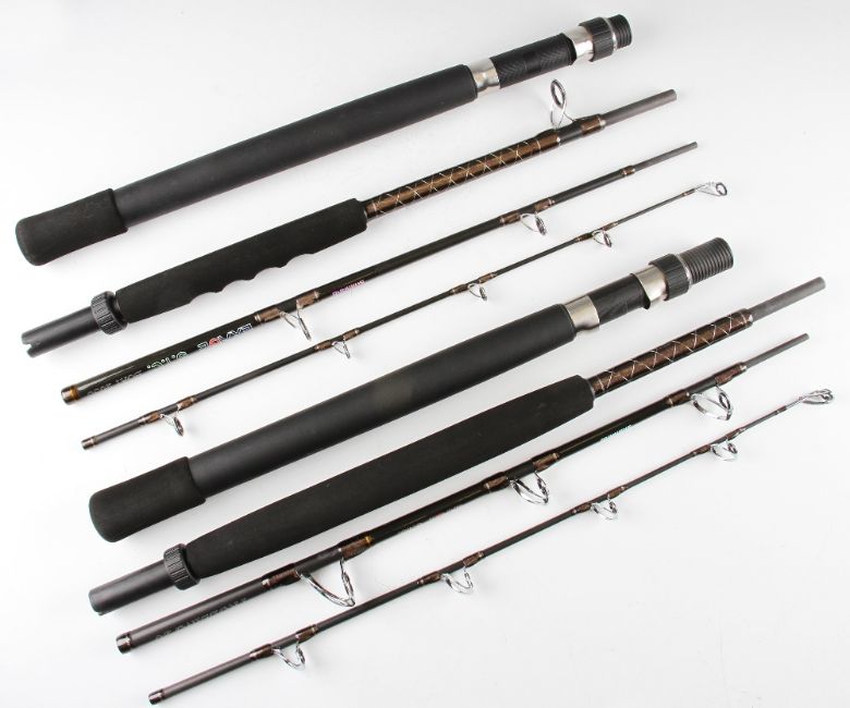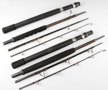 Pair of Carbon Shimano Travel Fishing Rods: Four piece Exage S.T.C. Trolling 20 7’ T.C. 20lbs together with Four piece Exage S.T.C. Boat 2030 6’.6” TC 20-30lbs both New with Cordura Cases (2)