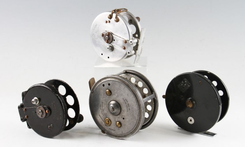 Collection of Hardy and other makers alloy casting reels (4); Hardy Bros Alnwick Silex No.2 wide drum alloy reel – original quarter rim cut out - completely customised with pillar drum core, rim lever removed – sold as seen; good Milbro Pelican 4.25” salmon reel, on/off check rim lever, chrome foot retaining most of the original green finish(G) plus 2x K Dowling & Sons Centre pin reels one in black finish one a bit sloppy (G);
