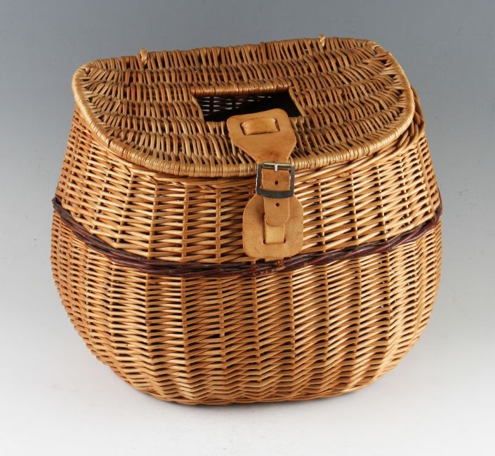 Fine wicker fishing tackle basket/creel – c/w the original leather and webbing shoulder strap overall 11.5” x 14” x 7.5”