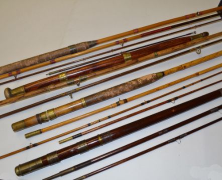 Interesting Combination Rods (4): Allcock, Redditch, 10ft/8ft 4pc, whole cane butt, whole cane spliced to Greenheart mid, Greenheart tops offering 2 options. Bridge guides, lined butt and tip, wrapped red, doweled brass ferrules, brass sliding band reel seat on 18ins sheet cork handle. MOB; Unmarked 10ft/8ft 4pc, whole cane butt, whole cane mid, Greenheart tips offering 2 options. CB; Gamages, London 8ft 3pc heavy trolling rod. Hardwood handle, whole cane mid and greenheart tip with ceramic lined guides, one guide missing lining MOB; and a Hogg, Edinburgh 10ft 3pc Hollow hardwood butt with Greenheart mid and tip. “wedding band” - marked on butt cap. CB (distressed).