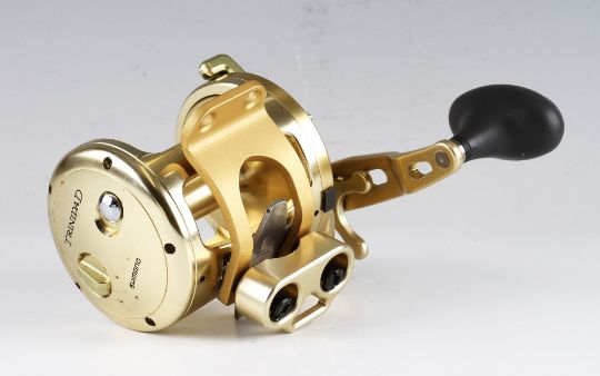 Shimano Trinidad 50 gold finish multiplier reel, Power handle and oversized soft touch knob, star drag, 4.9:1 gear ratio, as new, c/w papers in MOB.
