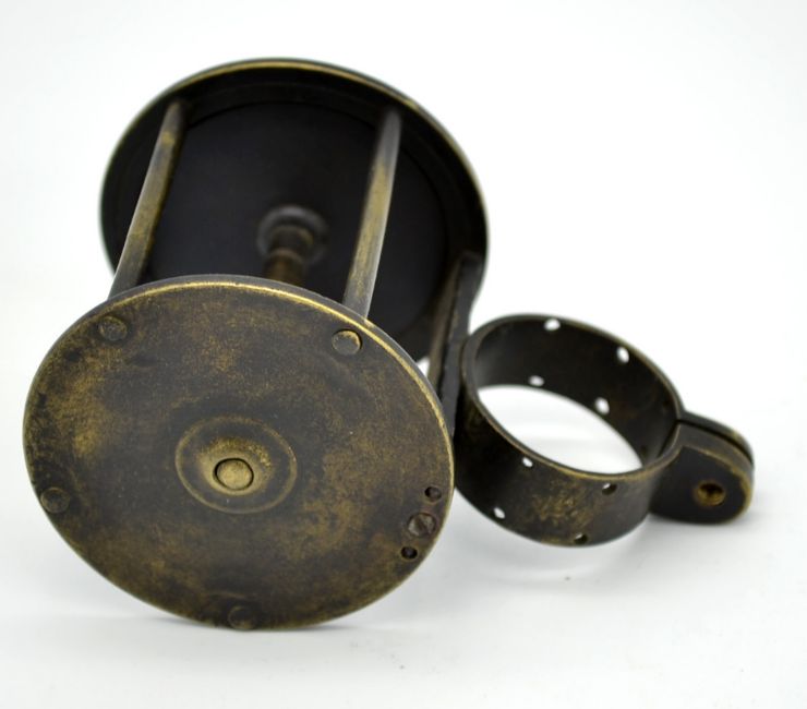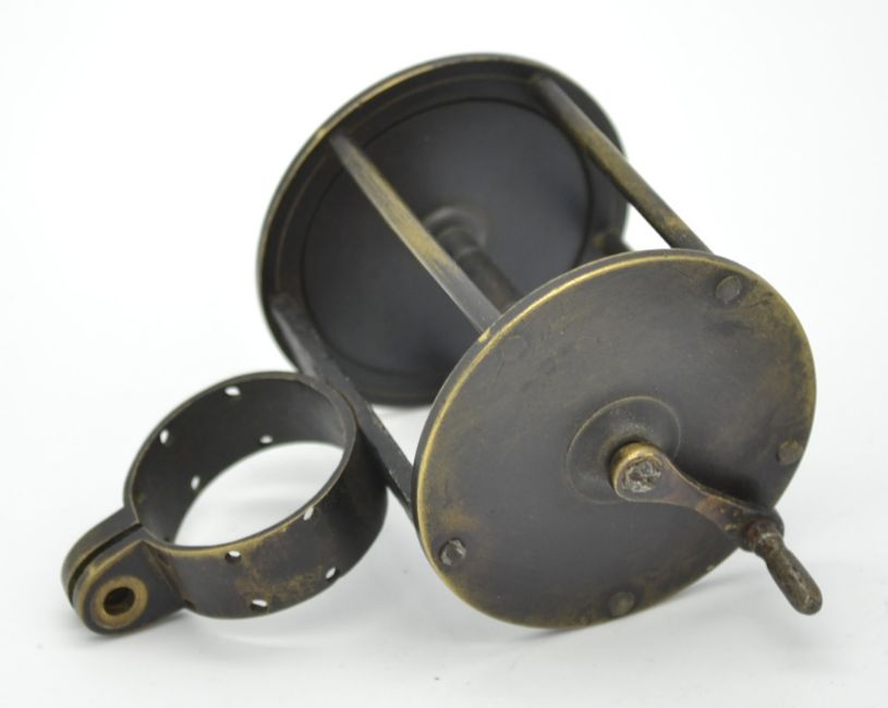 18th Century early brass collar winch wide drum fishing reel: 2.25” dia x 2.5” wide – with perforated collar, cast iron foot bridge – small waisted handle and knob