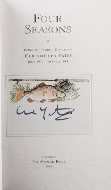 Yates, Christopher – signed “Four Seasons-being the fishing diaries of Christopher Yates June 1977-March 1981” publ’d by Medler Press 1996 ltd ed no 44/1489, bound in full green leather and signed to the main title page and comes in the original green cloth slipcase