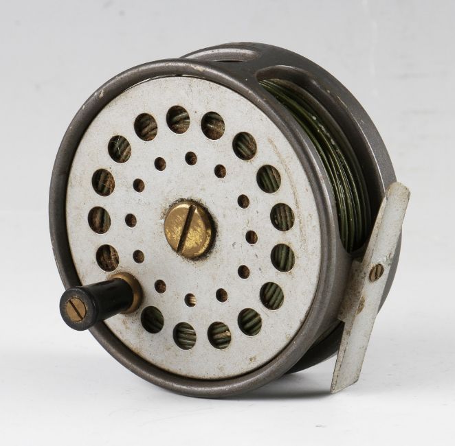 Sharpe’s Aberdeen The Gordon alloy fly reel: 3.75” Centre brass screw, black handle, alloy 2 screw foot, used condition c/w line