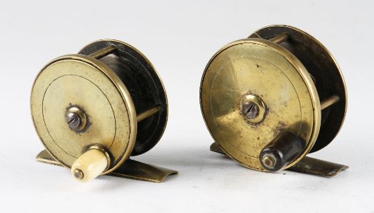 2x Vic C Farlow brass plate wind fly reels c.1890’s: C Farlow & Co 2.25” dia stamped with makers early “Fish” trademark to the foot, no check - turns freely; and C Farlow & Co Ltd 2.5” - constant check, and turns freely.