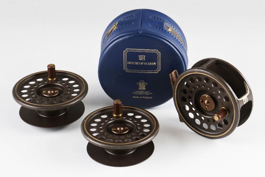 Hardy The Golden Prince 7/8 fly reel with 2x spare spools (3)– bronzed alloy foot - reversible U shaped line guide, quick release spool, correct smooth brass foot, rear drag adjuster – c/w makers padded case – some slight wear – otherwise runs smoothly