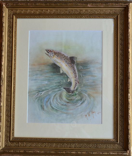 Hay, R.W (British) “Leaping Trout” water colour signed and dated 1961 by the artist – image 12.75 x 10 – in gilt swept frame overall 21.25 x 18”