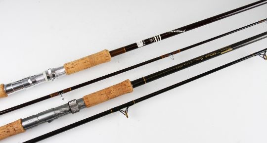 2x unused Shakespeare spinning rods: “Sigma Supra 1515” 9ft 10in (3m) 2pc – casting wt 30-40 - fully fitted with Fuji style guides& 28 inch cork handle (very clean) complete with anodised screw locking reel fittings-in MCB appears unused; and “International 1517” 8’6” 2 piece-casting weight 30-Agate lined tip guide& 24 inch cork handle fitted with alloy screw locking reel fittings appears unused in MCB.