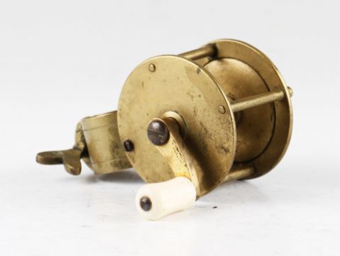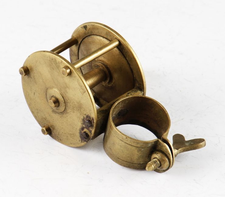 Unnamed Brass Collar winch reel: 1.75” dia – collar fitted with brass butterfly screw, curved crank arm – no check – runs freely