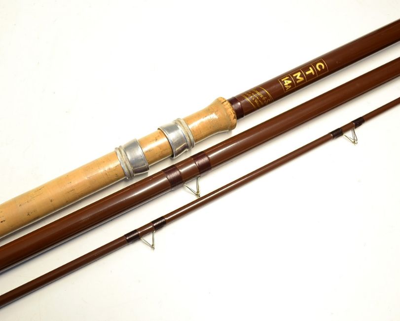 Bruce & Walker/ B James & Son float rod: CTM14A 14ft 3pc fibreglass, pink agate lined butt and tip guides - high bridge guides, alloy sliding reel fittings - 29ins trumpet style cork handle still retaining all of the original plastic sleeve – lightly used - MOB