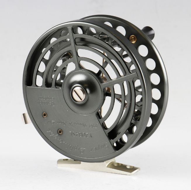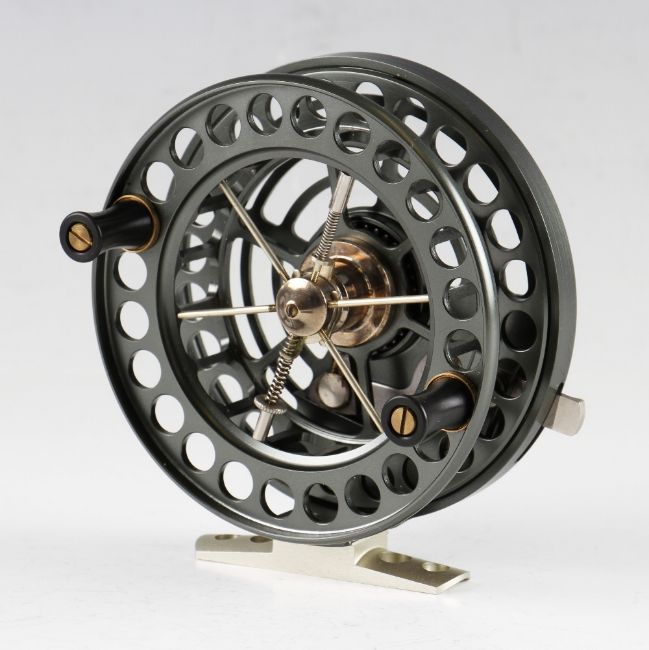 J W Young & Sons Centre Pin Y2084SL Fishing reel, 4.”x 3/4, 6 spoke, twin black handle, smooth brass perforated foot, super lightweight constitutes the ultimate in centre pin reel design, features click check, 2 ball bearings, micro-adjustable disc drag, unique cutaway cage less construction. c/w spare foot, Brand New in MOB