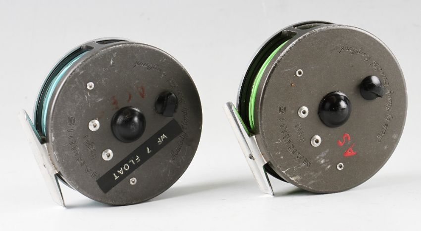 Hardy Marquis #8/9 trout fly reel: with black ebonite handle, two screw drum release latch, back plate drag adjuster, nickel “U” shaped line guide together with Hardy Marquis No.10 alloy fly reel, U shaped line guide, 2 screw drum latch, black handle, backplate tension regulator, c/w line (2) Note both in well used condition in MOB