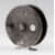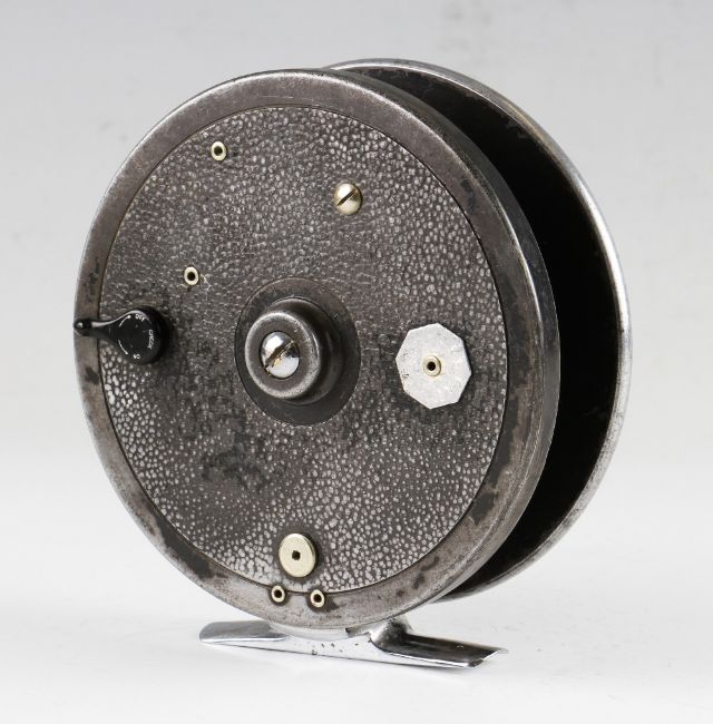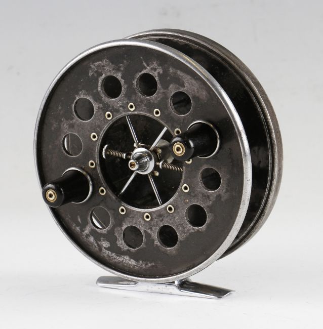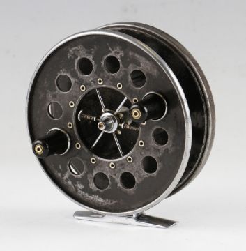 Allcock Aerial black alloy centre pin reel - 4.5" dia 6 spoke with tension regulator, black handles, chrome plated foot, pear shaped ratchet check lever, 10 perforations – black bubble back plate – general paint wear - runs smoothly