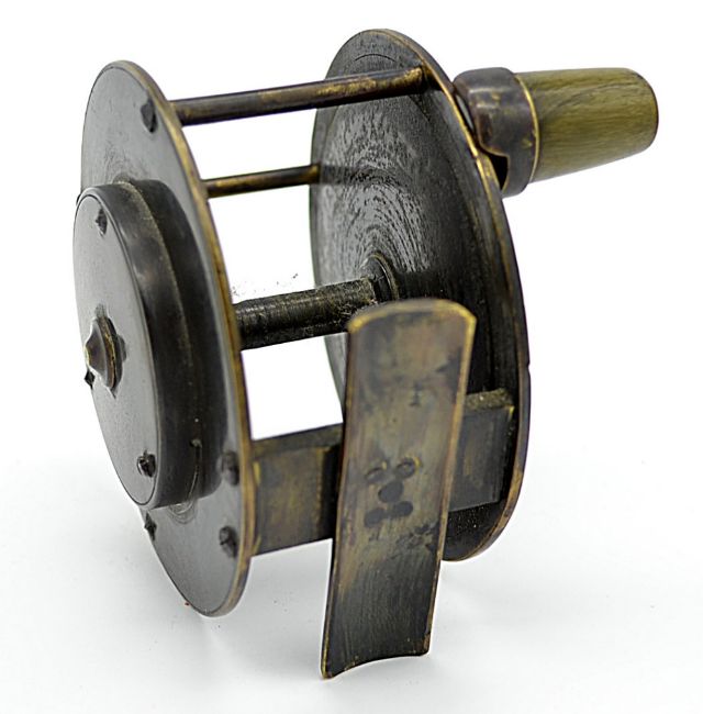 Scarce Chevalier Bowness & Son 12 Bell Yard, Temple Bar, London wide drum brass salmon reel: 3.1/2" dia - check, pillar drum guides, anti-foul strait crank wind arm with horn handle, smooth brass foot (shortened and some knocks)- constant and runs smoothly