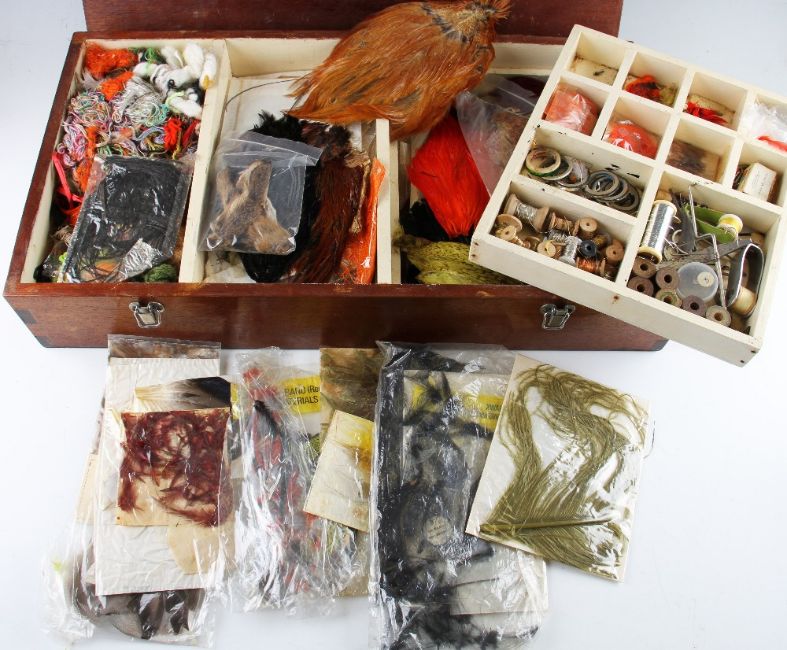 Large mahogany fly tying box and materials – include loads of various capes, feather and fur, fly tying material, tools et al - with removable lid to reveal 3 sections incl a lift out compartmental tray – overall 13” x 24” x 4.5” (inspection needed)