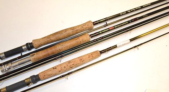 Graphite Fly Rods (3): Daiwa “Osprey” 9ft 6ins 2 pc #5-7. Single leg Fuji guides, (G); Leeda “Dragonfly” 11ft 3ins 3pc #7-9. - chip out of the cork handle (F/G) and a well-made but unmarked 8ft 2pc #4-5 fly rod. – all with screw locking reel fittings – all well looked after – all in either MOB or CBs
