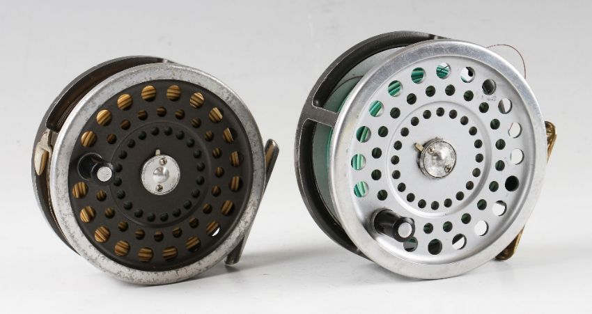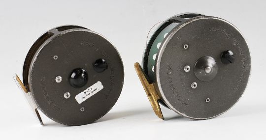 Pair of Hardy Marquis Salmon reels, To consist 4” Salmon No 1 smooth foot and No2 ribbed foot – 2 screw drum release latch, back plate check, black handle, U shape line guide c/w line (2) Note both in well used condition in MOB