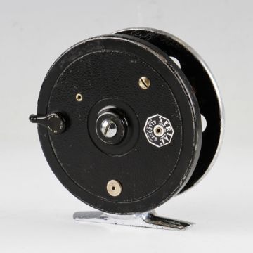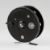 Allcocks Aerial black alloy centre pin reel - 3.75” dia - 6 spoke with tension regulator, chromed foot, pear shape backplate on/off check button – black bubble finish – some speckle rusting – runs very smoothly