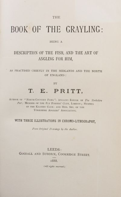 Pritt, T E – The Book of the Grayling- Leeds 1888, 3 coloured plates original blue cloth binding, George Heath Viner book plate inside front cover