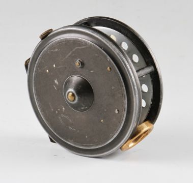 Foster Brothers of Ashbourne Fly Reel: 3.75” perforated face, brass rim tensioner, brass line guide, 2 screw latch, smooth foot, ivorine handle