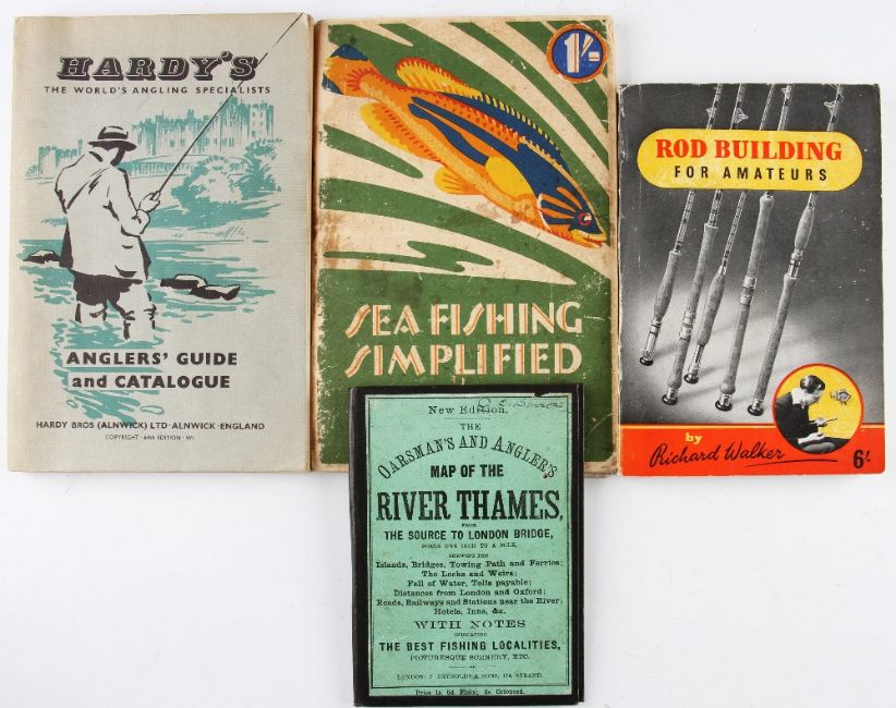 Interesting collection of Fishing Tackle Guides, Maps and Rod Building Books (6): 1957 Hardy Anglers Guide and Catalogue c/w scarce 1957/58 Price List and order form (G); Richard Walker “Rod Building for Amateurs” softback edition dated 1954 with the original wrappers (G); “Sea Fishing Simplified” by F D Holcombe in the original pictorial wrappers published by Henry Millwards & Sons and sent with their compliments: and New Edition The Oarsman’s and Angler’s Map of The River Thames from the source to London Bridge in the original card board covers complete with folding map incomplete from Sandford to London Bridge – interesting reading with notes on Best Fishing Locations, local rules et al