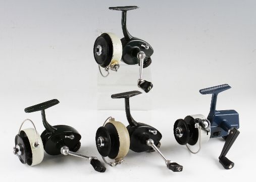 Collection of early Abu fixed spool spinning reels (4):2x Abu Svangsta 444A in green and cream finish both with folding handles and retaining most of the original finish; and early Abu 444 with black and grey finish, folding handle (some minor rim wear); and Abu Cardinal 40 in blue and grey finish, folding handle some slight paint wear to the foot otherwise overall (G)