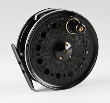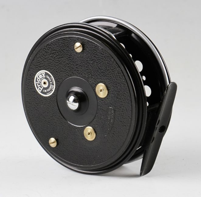 Fine J.W Young & Sons The Pridex salmon fly reel: 4” dia with twin clip on line guard – black bubble finish – unused in mint Hardy Bros padded case and makers maintenance leaflet – to be used with the previous lot rod