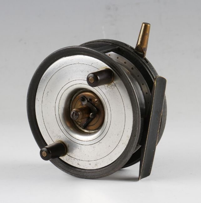 Scarce C Farlow & Co Ltd London Grenaby Spinning Pat Alloy salmon reel: 4.25” dia - smooth brass foot – rim on/check button, rim brake lever and stamped with patent number 16545 08 to the back plate c/ew makers Holdfast logo - catches slightly