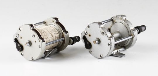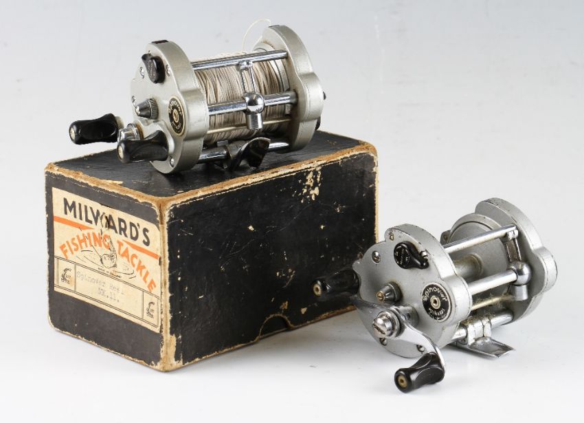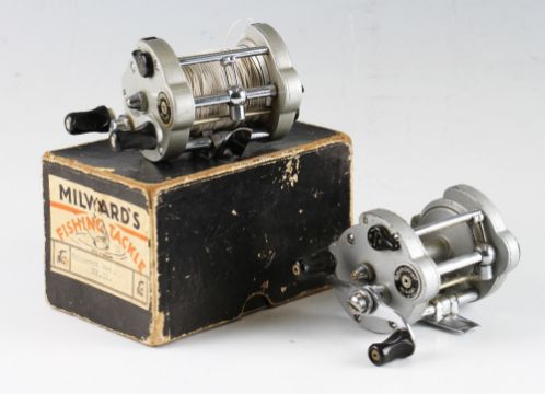 Pair of Milwards pattern bait casting multiplier reels, Milward Spinover Mk II, hinged foot, twin black handles .level wind and ratchet adjusters, good in original makers box together with a used example (2)