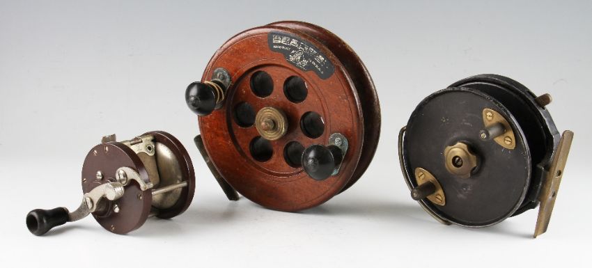 3x Sea Reels: Ogden Smiths London “The Seaos” 5” alloy big game/tope reel, with twin black composite replaces handles - brass central drag knob, nickel bickerdyke line guide, side lever check, some paint loss; large “Sea Reel” 7” Scarborough Wooden and brass stem reel with twin composite handles – used c/w line; and an Ocean City Brigantine multiplying reel fitted with Pflueger leather brake pad – on/off check button and rim brake lever – some speckle corrosion to the chrome – otherwise runs well; and