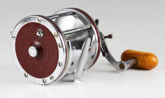 Penn Senator 114-H Big Game Reel: Stainless steel frame with Bakelite end plates, on/off check, star drag, orange composite torpedo handle, decorative big game scene to the end plate, harness lugs for fighting harness – very lightly – overall (G)
