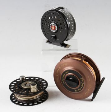 3x interesting fly reels and spools: good J.W Young & Sons Neauvex Series 1 trout fly reel – 3 5/8” dia c/w line in Orvis pokey bag (VG); Ryobi Super Light Magnesium reel 2 7/8” dia in chamois leather bag; and Ari T’Hart 3” spare spool c/w WF6 F/S fly line and in makers bag