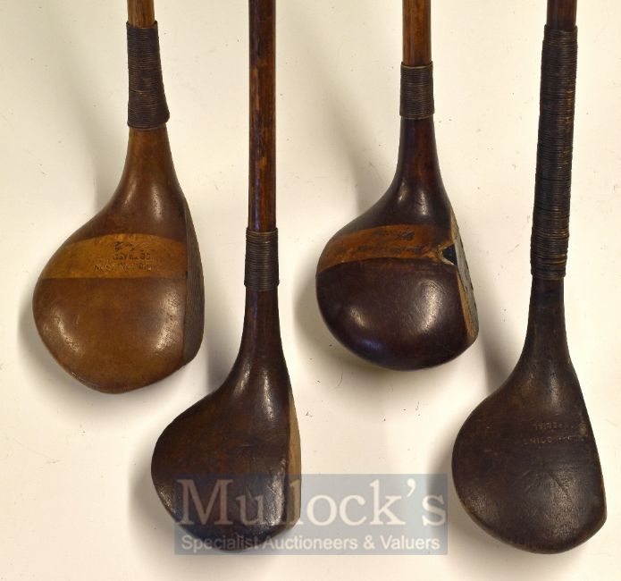 C Gibson and Son Westward Ho! Stripe Top Driver in light stained persimmon plus a Jas Stephens stripe top bulldog baffie, a Vichand dark stained driver together with a W Higgins brass sole plate brassie (4)