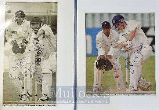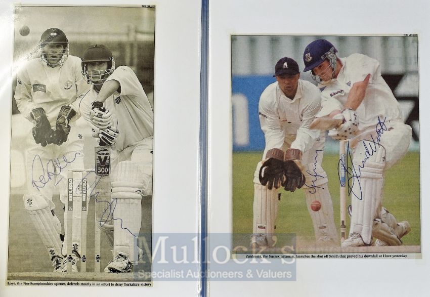 Cricket – 2001 County Cricket Teams Signed Newspaper Cuttings including Marcus Trescothick, Dougie Brown, Matthew Maynard, Andrew Davies, Mark Wallace, Graeme Welch, Robin Smith, Jimmy Maher, Mark Butcher, Keith Dutch, Michael Burns, Mark Wagh, Jamie Spires, David Byas and others, approximately 41 total, all corner mounted on card, housed in folder.