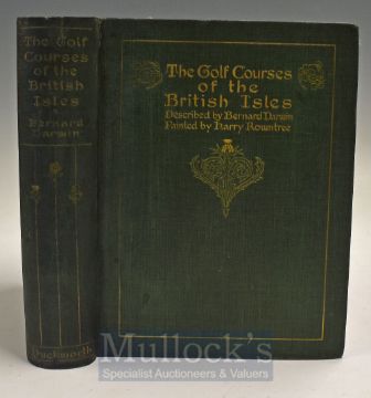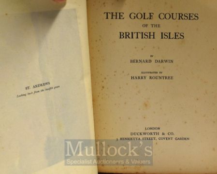 Darwin, Bernard - “The Golf Courses of the British Isles” 1st ed 1910 with illustrations by Harry Rountree c/w tissue covers - in original green and gilt cloth decorative boards and spine (professionally and cleverly rebound hard to detect) internally some speckle foxing and discolouring to the edge of the pages – hence overall (F+++)