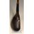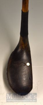 J Adamson Dark Stained Persimmon Mallet Head Putter showing the oval maker’s mark to the crown next to the white inlaid aiming dot with fibre insert to the sole – full leather grip