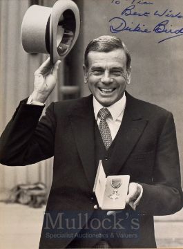 Harold Dennis ‘Dickie’ Bird Signed Cricket Print depicts Bird receiving his OBE medal, signed in ink to the front ‘To Tim, Best Wishes Dickie Bird’, framed measures 26x33cm approx.