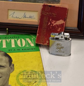 Len Hutton Cricket Collection to consist of Ronson Lighter having the Yorkshire Rose with from Len Hutton, 1948/49 miniature cricket bat, framed signed photograph together with 2 related publications (5)