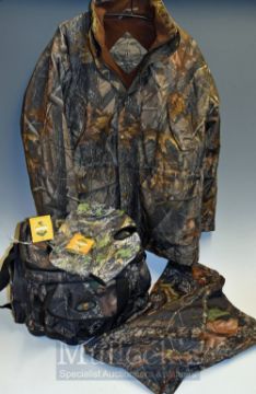 Deerhunter Outdoor Clothing Jacket – Fleece Fabric camo jacket with zipped and press-stud front,2 large pockets, lining lined size L together with matching trousers gloves, head cover, bag overall very clean