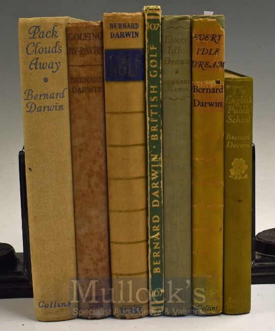Darwin, Bernard golf book selection (7) – titles incl “Every Idle Dream” 1st ed 1948 c/w dust jacket (shelf wear); “British Golf” 1st ed 1946 c/w dust jacket (some shelf wear to the spine); others include “Golf” - Pleasures of Life Series 1st ed 1954 (Used); “Golfing By-Paths” 1st ed 1946 (worn); “Pack Clouds Away” 1st ed 1941 (boards have sign of wear); “Every Idle Dream 1st ed 1948 (with faults) and “The English Public School” 1st ed 1929 the spine faded-all in mixed condition