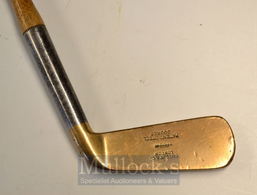 Bussey Patent Steel Socket Putter with metal and brass head, showing a clear maker’s mark to the head, fitted with the original stitched leather Bussey patent perfect handle